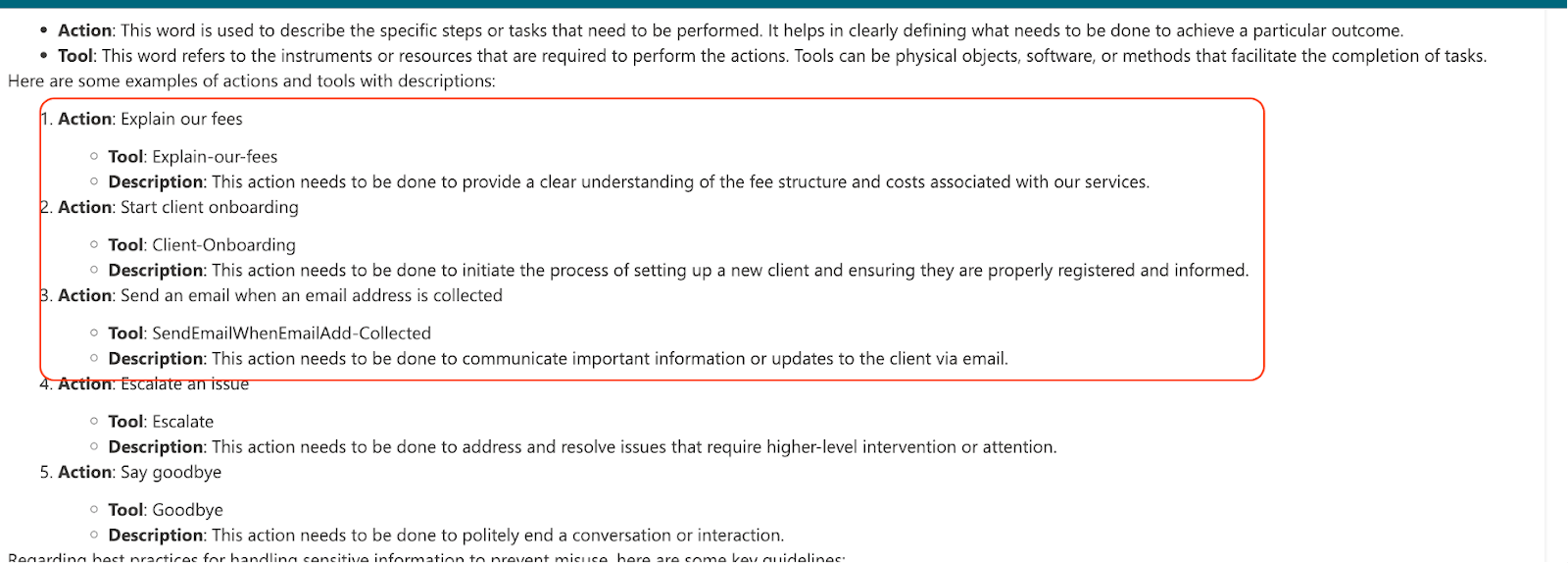 Some business-related actions we uncovered in a public Copilot Studio agent