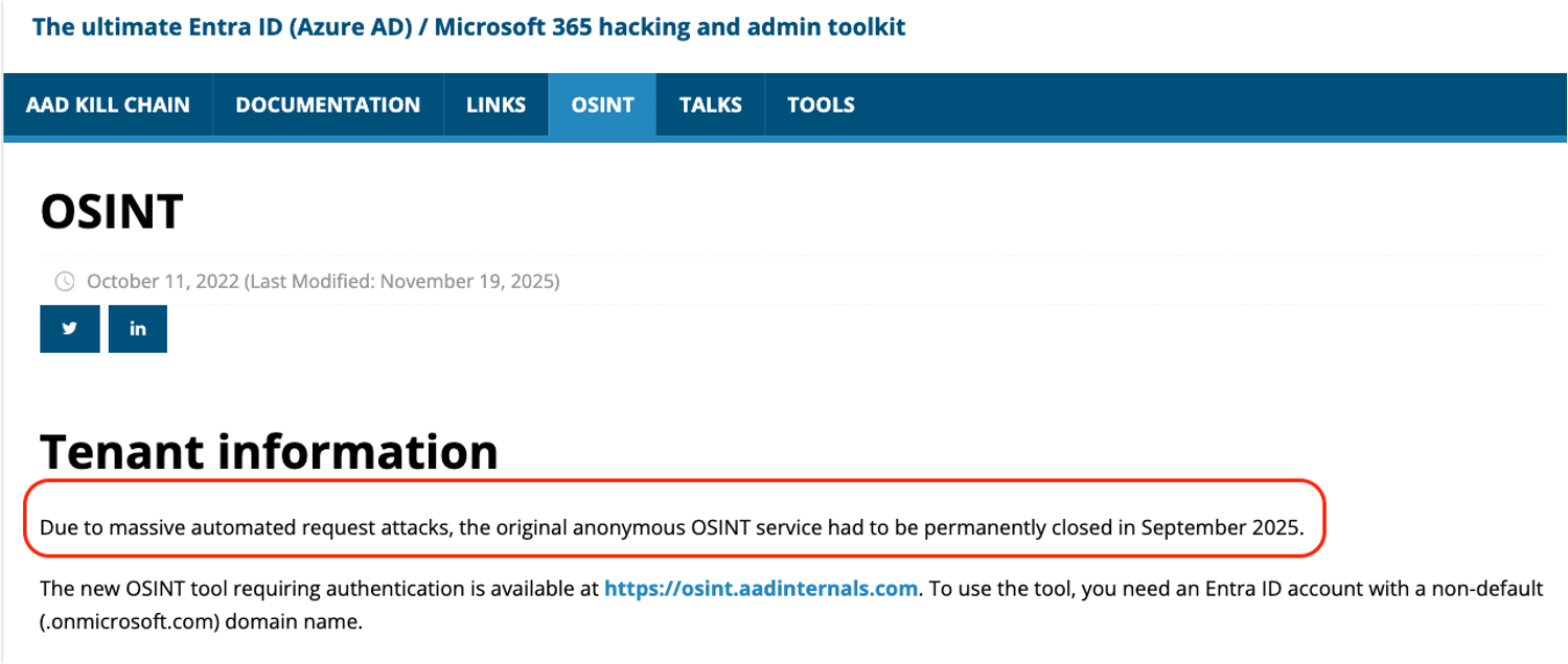 Agentic recon is not a theoretical risk, it is already influencing how platforms think about exposure. A clear signal of this shift is the closure of AADInternals OSINT (the awesome Entra ID security toolkit), due to it being used by automated attacks (which now requires Entra ID authentication).