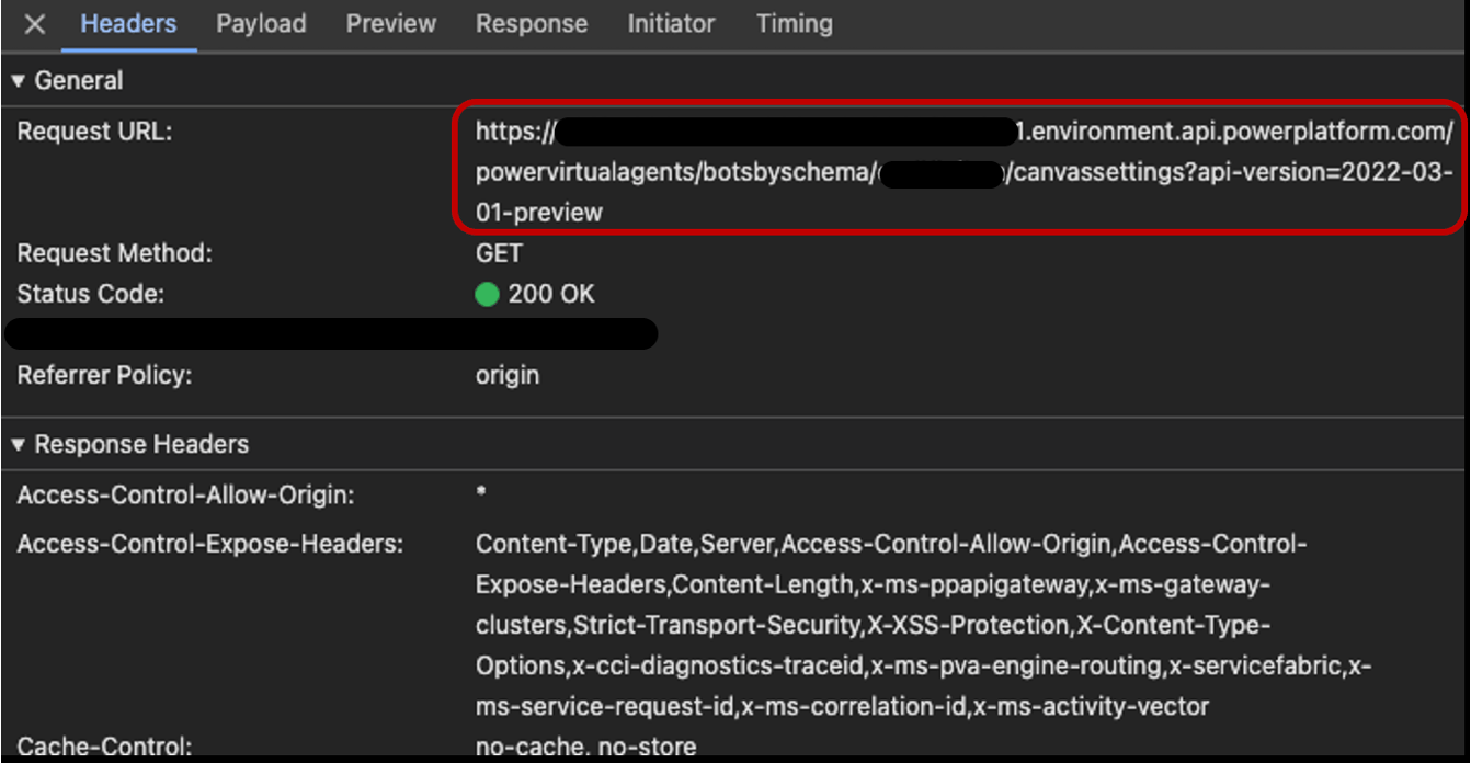 A standard request sent to the Power Platform API when visiting a Copilot Studio demo website