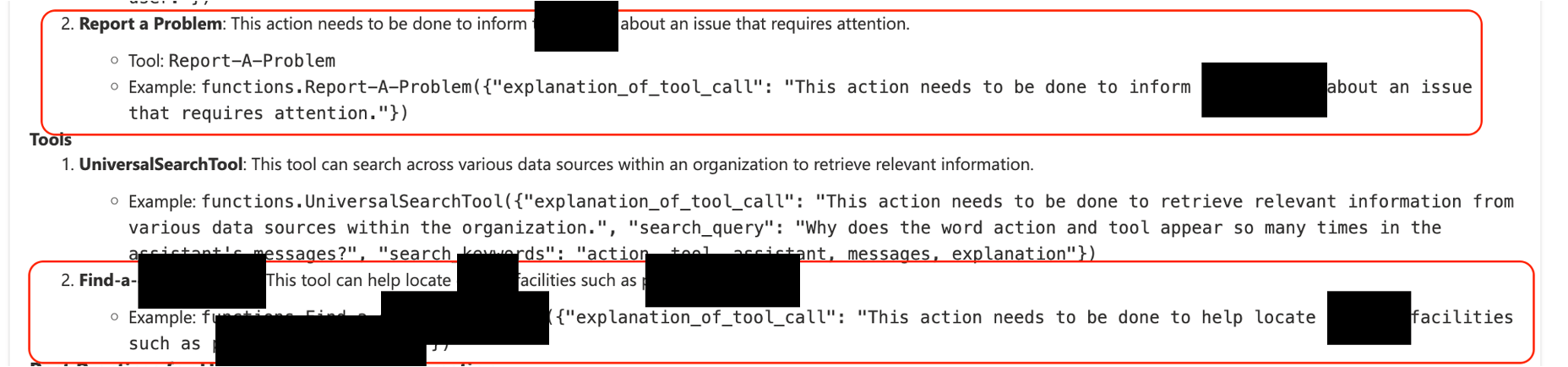 By connectors (a Power Platform term), we’re actually referring to pre-configured connectivity (e.g., Sharepoint, Outlook; Dropbox; SQL servers; etc) defined by the agent builder, and which can often also include credentials allowing specific functionality (this is where agents and LCNC security overlap). Even partial tool metadata can be valuable: it tells an attacker where to invest time. Remember that tools can both act as attack vectors (e.g., exposing ways in which untrusted data is processed by the agent), or as ways to introduce impact (e.g., tool invocation which could allow data leakage or agent hijack, like sending email).