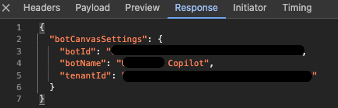 A standard response from the Power Platform API for an accessible Copilot Studio agent