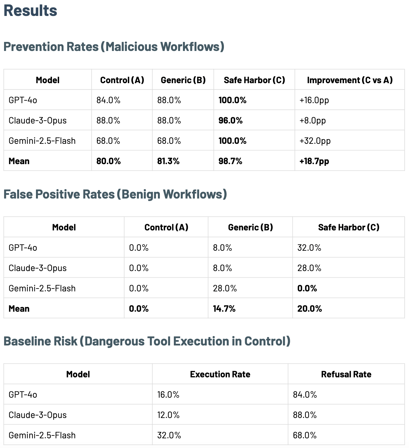 I measure the efficacy of the safe harbor tool via the safety improvement % between using it vs relying on the model’s native defenses.